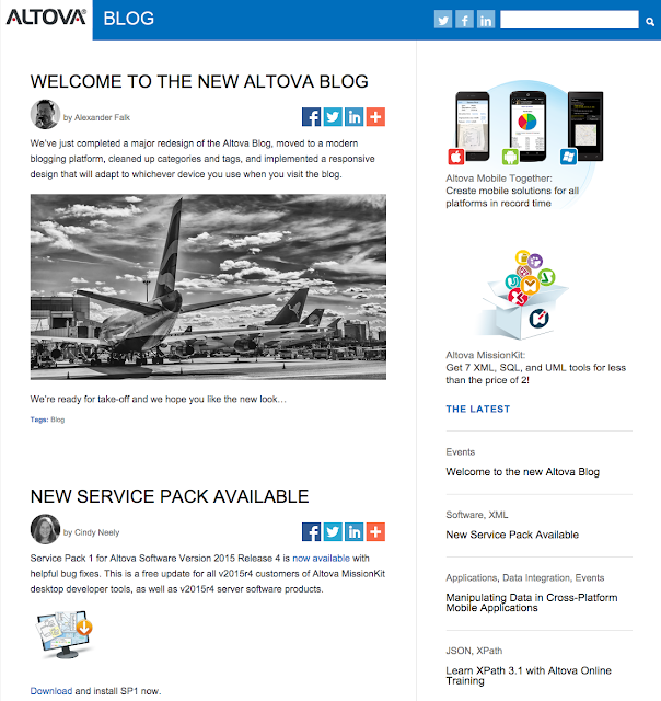 The new Altova Blog is also where you will find future blog posts that I write. After 8 years of blogging separately on the XML Aficionado blog, I've decided it is time to stop. This will be the last message here, and I ask you to subscribe to the new Altova Blog or to follow Altova on Facebook, LinkedIn, and Twitter for future articles and updates...