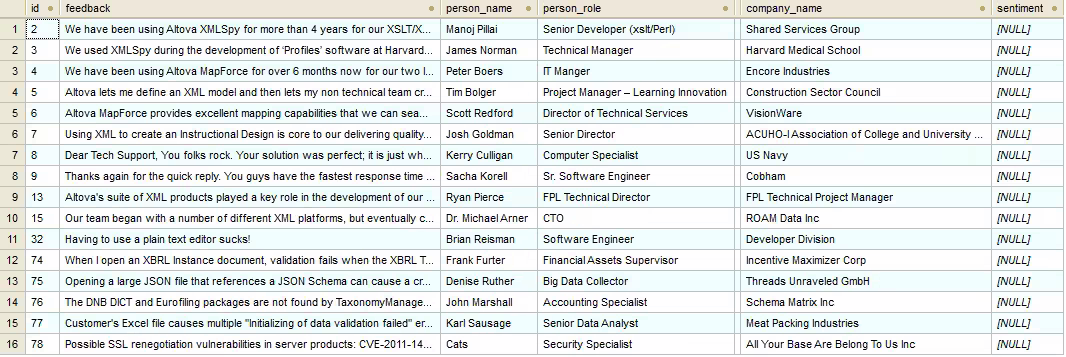 And we have some example data in it that will allow us to run our integration tests in MapForce and determine the sentiment of all these pieces of customer feedback: