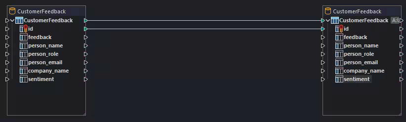 The first step to design our ETL mapping is to insert our CustomerFeedback database object twice into the mapping – once as input (the extract part of ETL) and then also as the final output, and to connect the main table object as well as the id. MapForce will be so nice to connect all the other columns, too, but we don’t actually need those connections, so you can get rid of them again until you have this design: