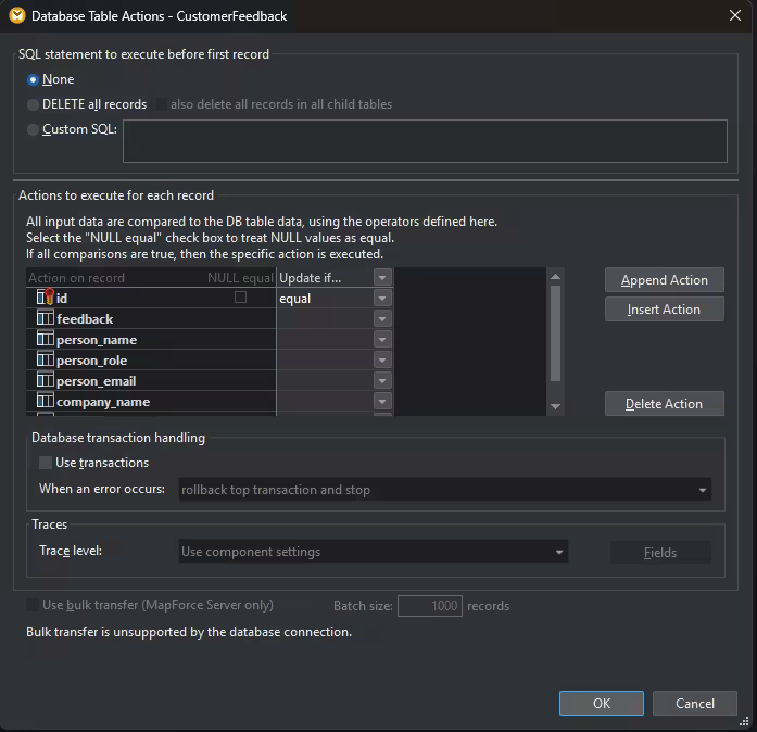 Make sure that the first radio button is set to None, because we don’t want to do anything special before the first record, and then change the column header of the second column to “Update if…” and the combo box in the id row to “equal”. This tells MapForce to update the data in the database for any record where the id provided via the mapping is equal to an id that already exists in the database. That’s all we need to do here, so you can click OK again.
