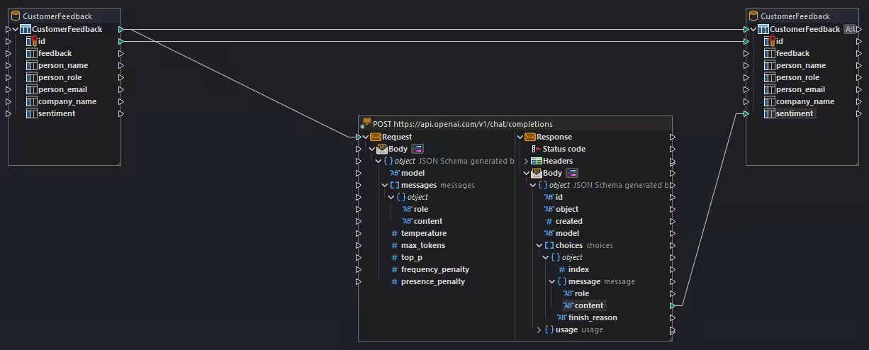 Now we have all the ingredients ready to create our MapForce transformation or ETL project that will read all the records from the database, call the OpenAI API to get the sentiment analysis, and write the results back into the database.