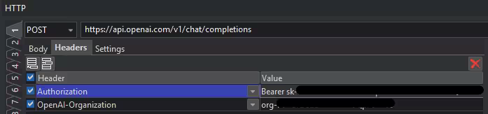Now we need to provide our secret API key in the Headers in order to authenticate our request, so click on the Headers tab and add one row with the header “Authorization” and a value that starts with “Bearer“, followed by a space, followed by the secret API key. If you have multiple accounts with OpenAI and need to ensure correct billing, you can also optionally add a second row with the header “OpenAI-Organization” and the value set to your assigned organization value from OpenAI: