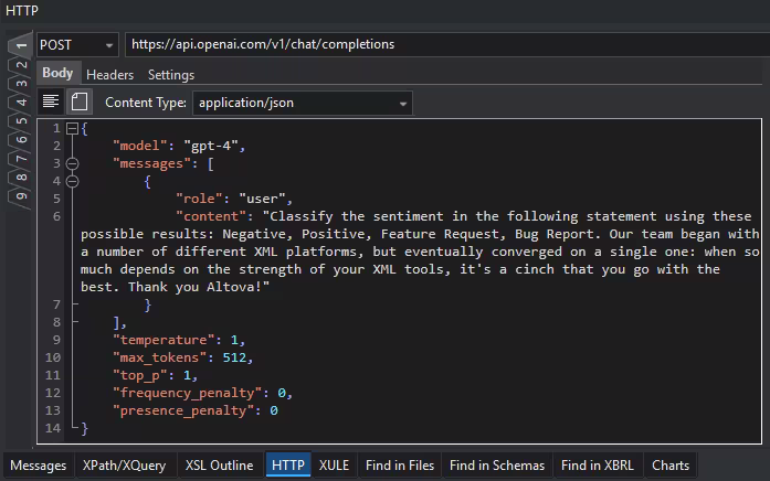 As a next step, we want to make sure we understand the OpenAI chat API correctly and take a look at the resulting JSON output. We’re going to do a manual test run using the handy [HTTP test window](https://www.altova.com/xmlspy-xml-editor/advanced#http-window) in XMLSpy, which you can find right below your main working window as a separate tab next to the Messages window.