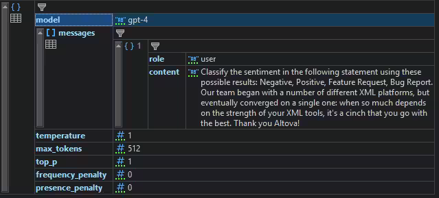 The first good news is we got a 200 OK result back within 780ms and some content of the type application/json, which is our response payload in JSON format, and it contains a message with the answer that the AI “assistant” has provided in the form of the content “Positive”. So we’ve been able to replicate our prior test in the OpenAI Playground nicely from within XMLSpy by sending an actual HTTP request to the API and getting the correct response.